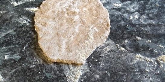 Flour a flat clean surface and flatten these out to about 5mm I guess, using your fingers or palm. Remember this is bush craft, no roller.